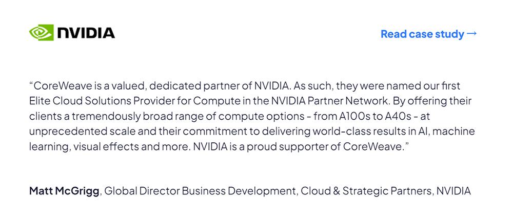 打開(kāi)CoreWeave官網首頁,可(kě)以看(kàn)到₽₽(dào)英偉達為(wèi)其背書(shū):“Coσ ₽•reWeave是(shì)英偉達的(de)重要(yào)合作(zuò)夥伴™£……英偉達是(shì)CoreWeave的(de)支持者,我們為(w↑©↕èi)此感到(dào)自(zì)豪。” "¥∞<;