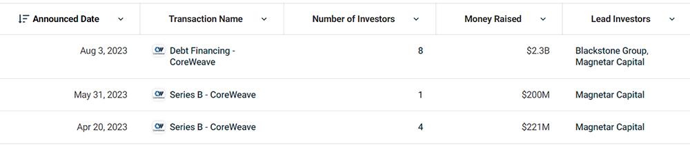 先是(shì)在4月(yuè),CoreWeave獲得(de)英偉達參投的(de)2.21億美(měi)元B輪✘φ融資,又(yòu)在1個(gè)月(yuè)後獲得(♠≈©de)領投基金(jīn)Magnetar Capital的(de)2億美(měi)元延期投資。