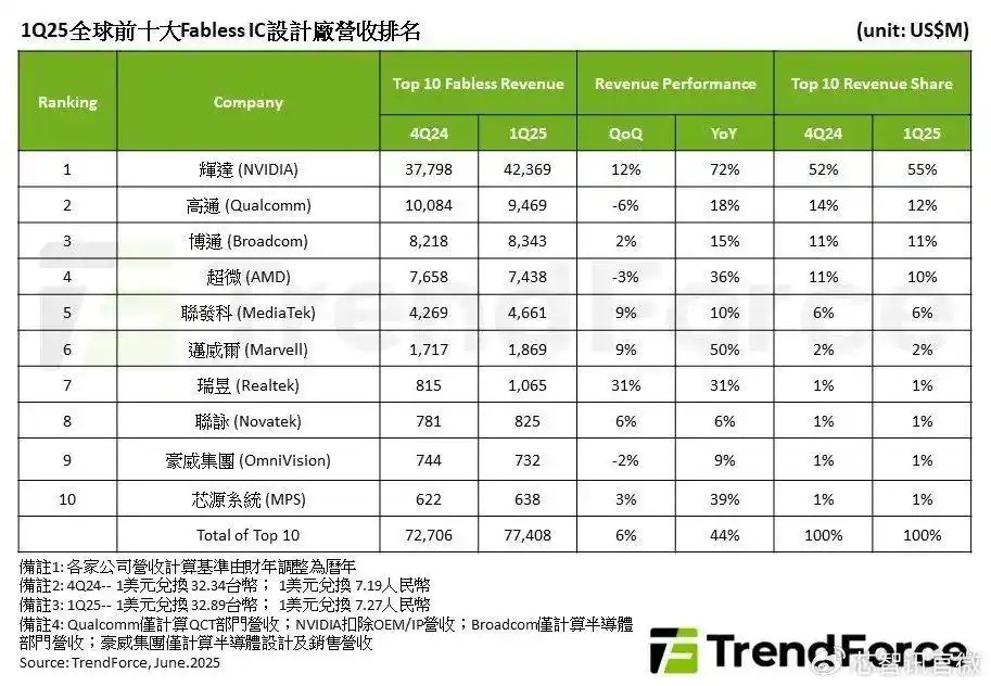 2025Q1全球十大(dà)IC設計(jì)廠(chǎ ¶ ng)商:英偉達穩居第一(yī),豪威第九!